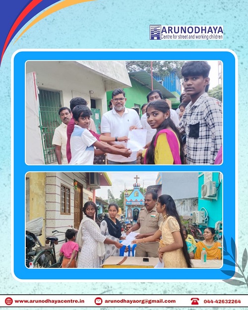 The School Enrollment Awareness Campaign was officially launched today at All India Radio, Ennore. This initiative was jointly organized by Chennai Corporation Zone 1 and Arunodhaya. The event was attended by Mr. Dhaniyarasu (Chairman – Zone 1), Mr. C. Vijaybabu (Zonal & Revenue Officer – Zone 1), engineers from Division 3, school Headmasters, teachers, and community leaders Mr. Balaraman and Mrs. Poongodi. 👨🏫👩🏫👷♂️ A vibrant street play was performed by children from Arunodhaya Children Sangam and youth members. 👧👦 Their powerful performance received appreciation from the audience, with local children and residents sharing their feedback. 🙌🗣️