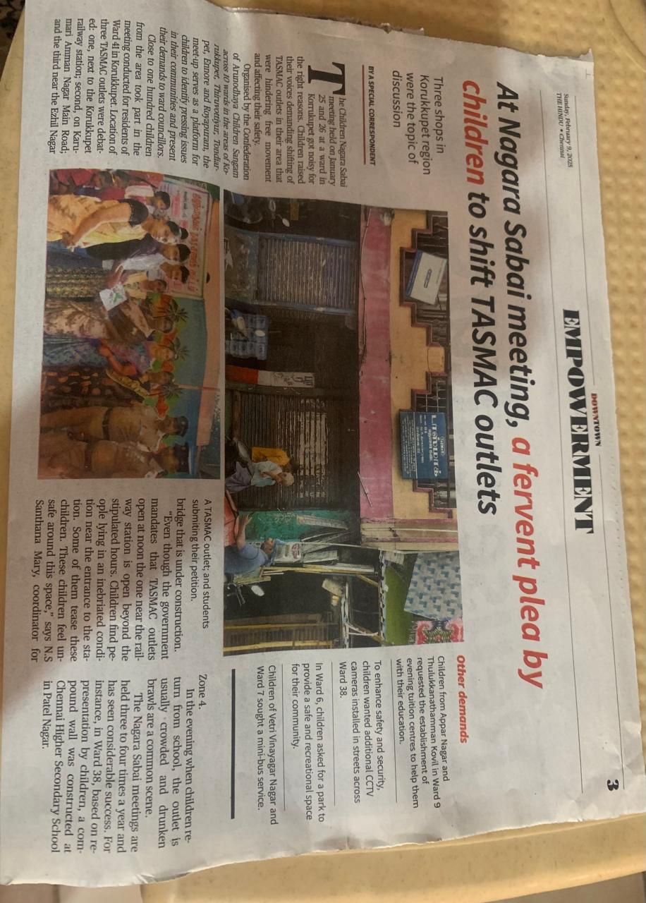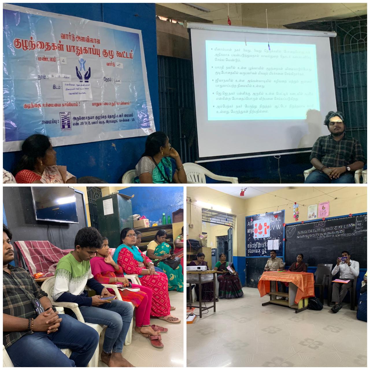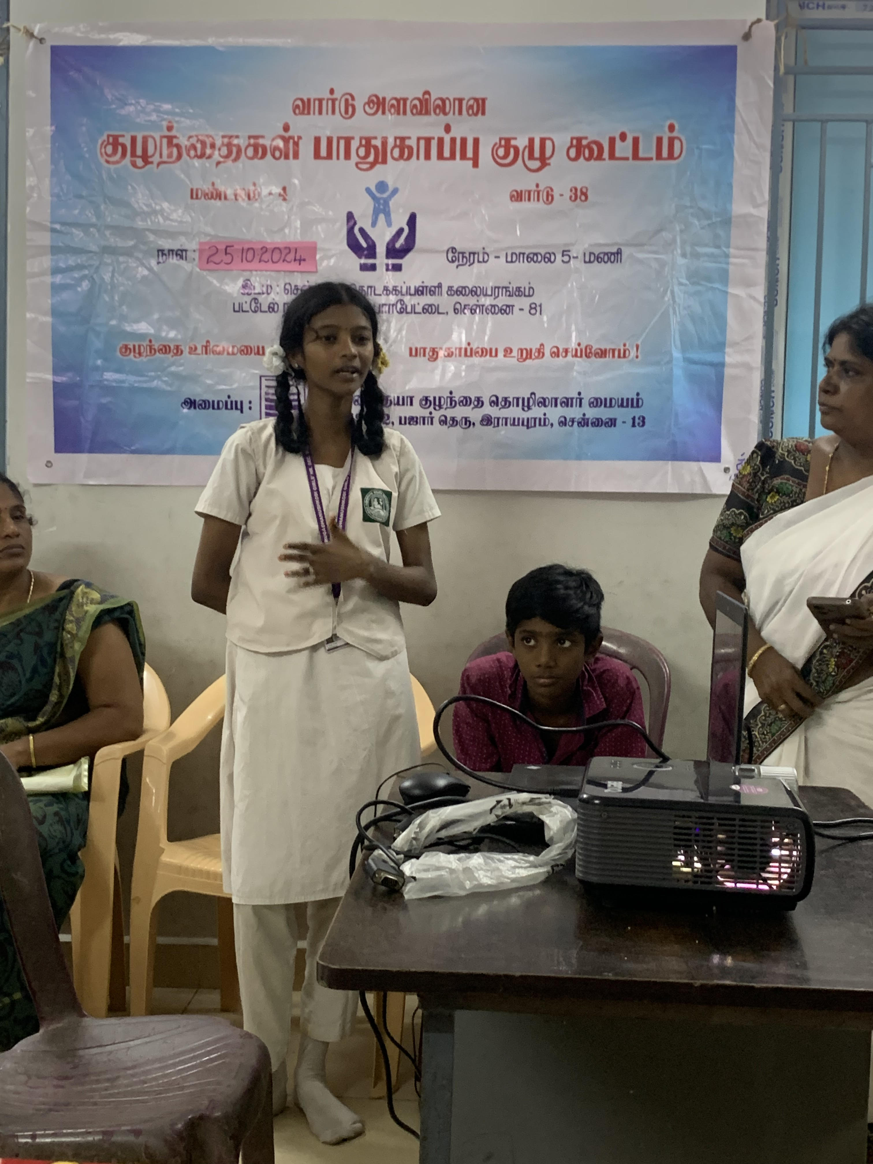 The third quarterly meeting of Ward level (ward 38) Child Protection Committee was held on 25th October 2024 chaired by the Councilar Mr. U. Ganesan. Strategies and action points to make the Ward a child friendly ward was discussed. The meeting was organised by Arunodhaya.