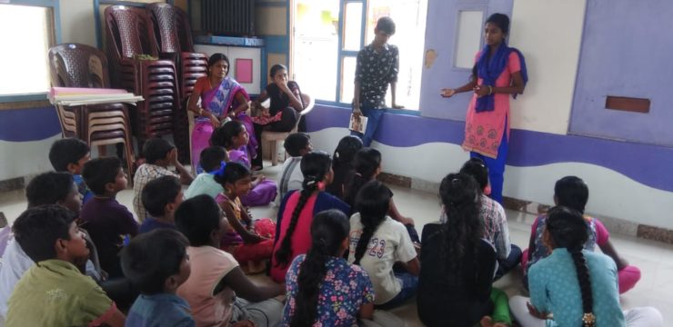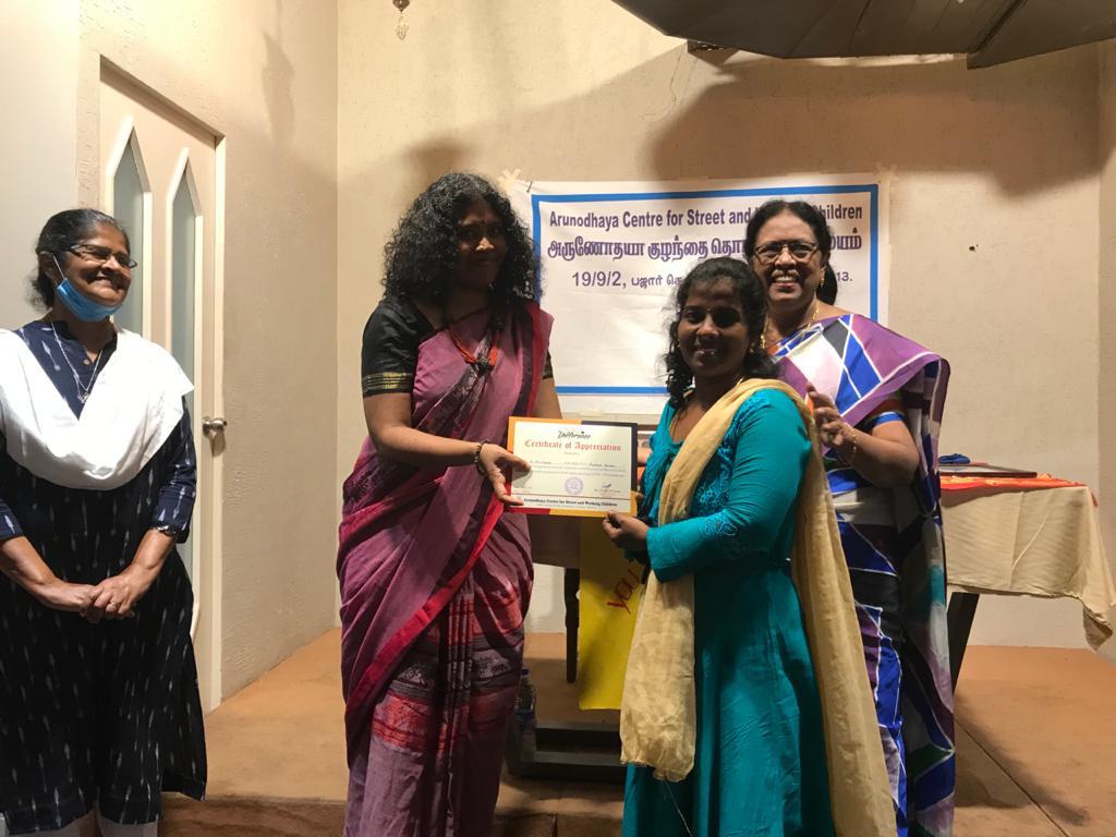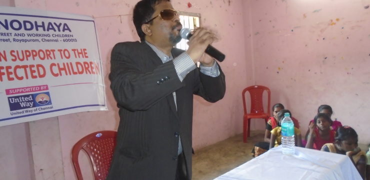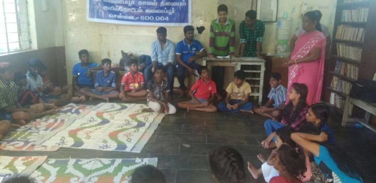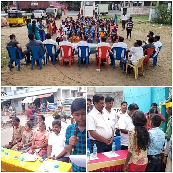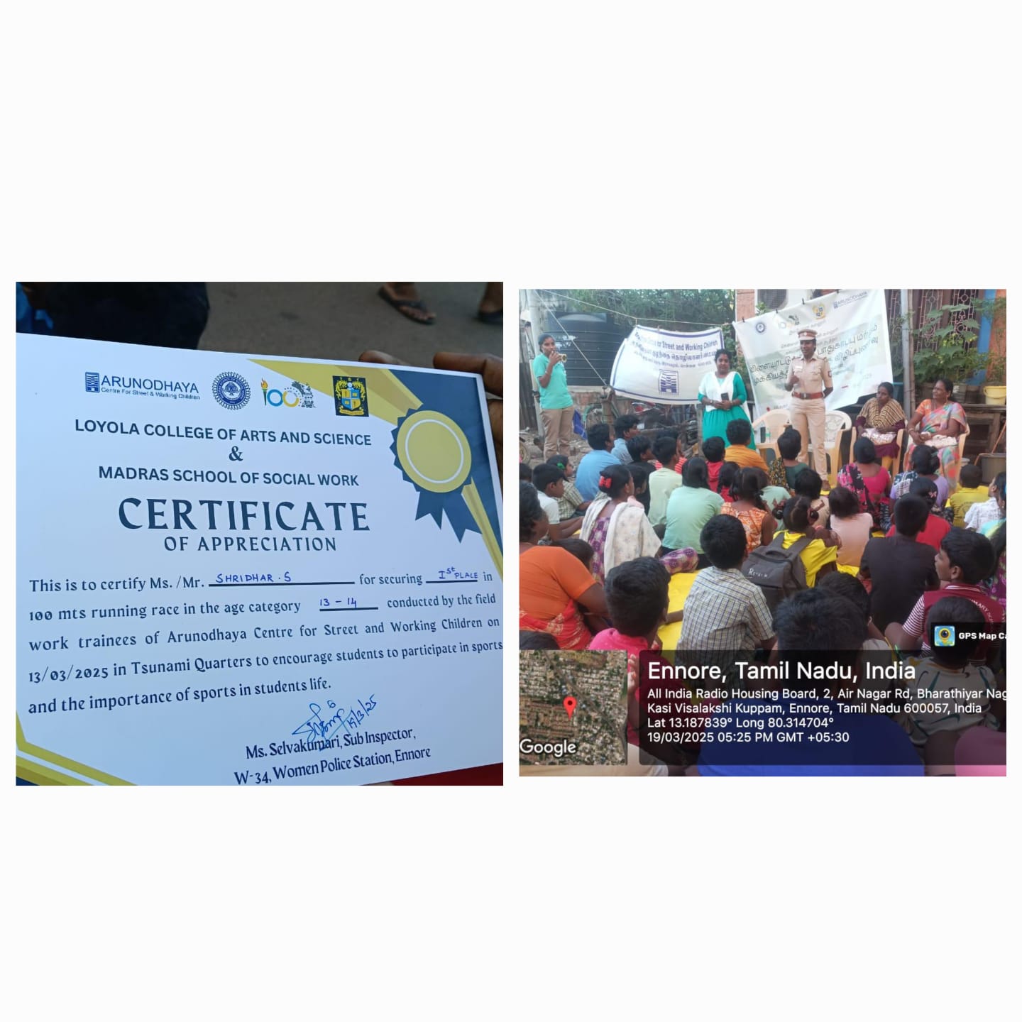 Awareness programme on encouraging children to participate in sports activities was held in AIR site, Ernavur on 19th March. The programme was organised by Arunodhaya facilitated by the student trainees from Loyola college and Madras school of social work. Ms Selvakumari, sub Inspector of police was the chief guest and distributed certificates to the winners in the sports events.