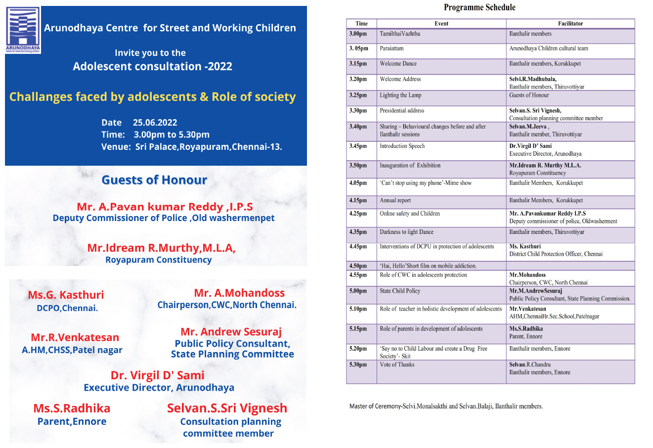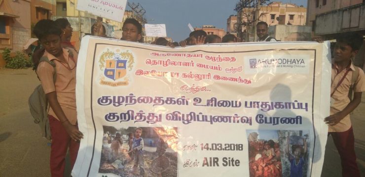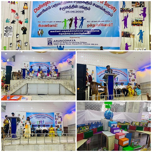 Arunodhaya organised awareness programmes on World child labour day. Rally in Royapuram, handprint against child labour in Tondiarpet in the presence of Ms Jayalakshmi, Asst commissioner of labour, oath taking by stakeholders in Egmore railway station followed by street play, signature campaign in the platform in Egmore railway station.