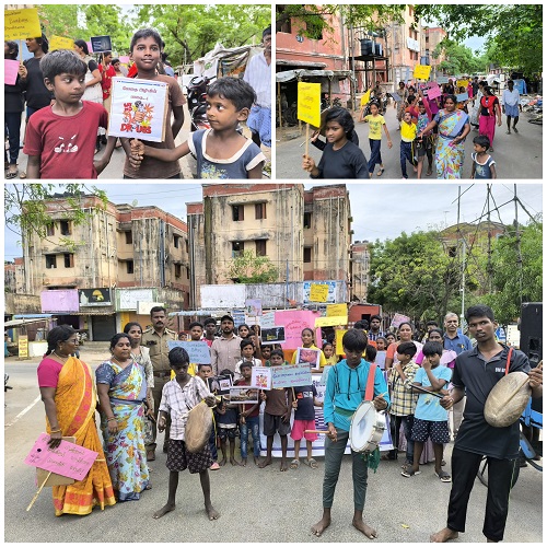The School Enrollment Awareness Campaign was officially launched today at All India Radio, Ennore. This initiative was jointly organized by Chennai Corporation Zone 1 and Arunodhaya. The event was attended by Mr. Dhaniyarasu (Chairman – Zone 1), Mr. C. Vijaybabu (Zonal & Revenue Officer – Zone 1), engineers from Division 3, school Headmasters, teachers, and community leaders Mr. Balaraman and Mrs. Poongodi. 👨🏫👩🏫👷♂️ A vibrant street play was performed by children from Arunodhaya Children Sangam and youth members. 👧👦 Their powerful performance received appreciation from the audience, with local children and residents sharing their feedback. 🙌🗣️
