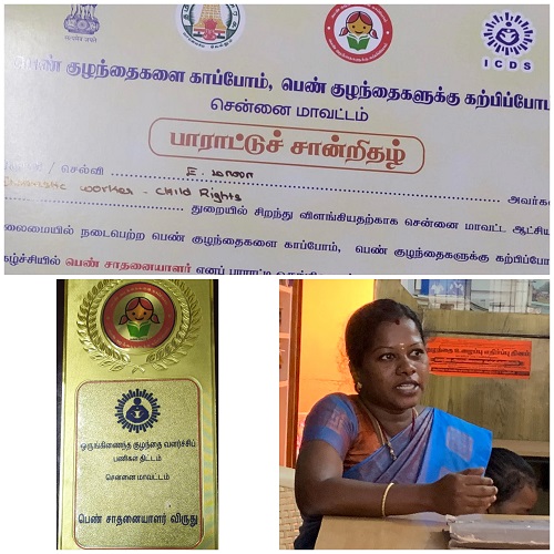 E. Mala, former member of Confederation of Arunodhaya children sanga received ' Pen Sadhanaiyalar' award on 3rd March 2023 from Chennai Collector.